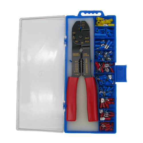 Kit pratique pour réaliser vos connexions électriques de manière simple et sécurisée. Comprend une pince à sertir ergonomique ainsi qu’un assortiment de terminaux isolés, idéal pour les réparations et installations.