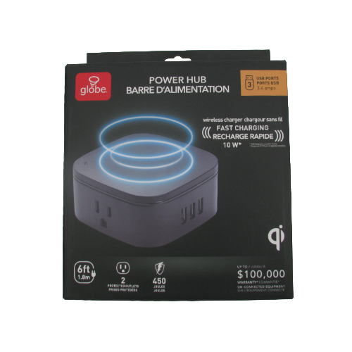 Station de recharge compacte pour bureau avec 2 prises mises à la terre, 3 ports USB (3,4 A total) et un chargeur sans fil rapide de 10 W. Idéale pour brancher ordinateurs, lampes et recharger téléphones ou tablettes simultanément.